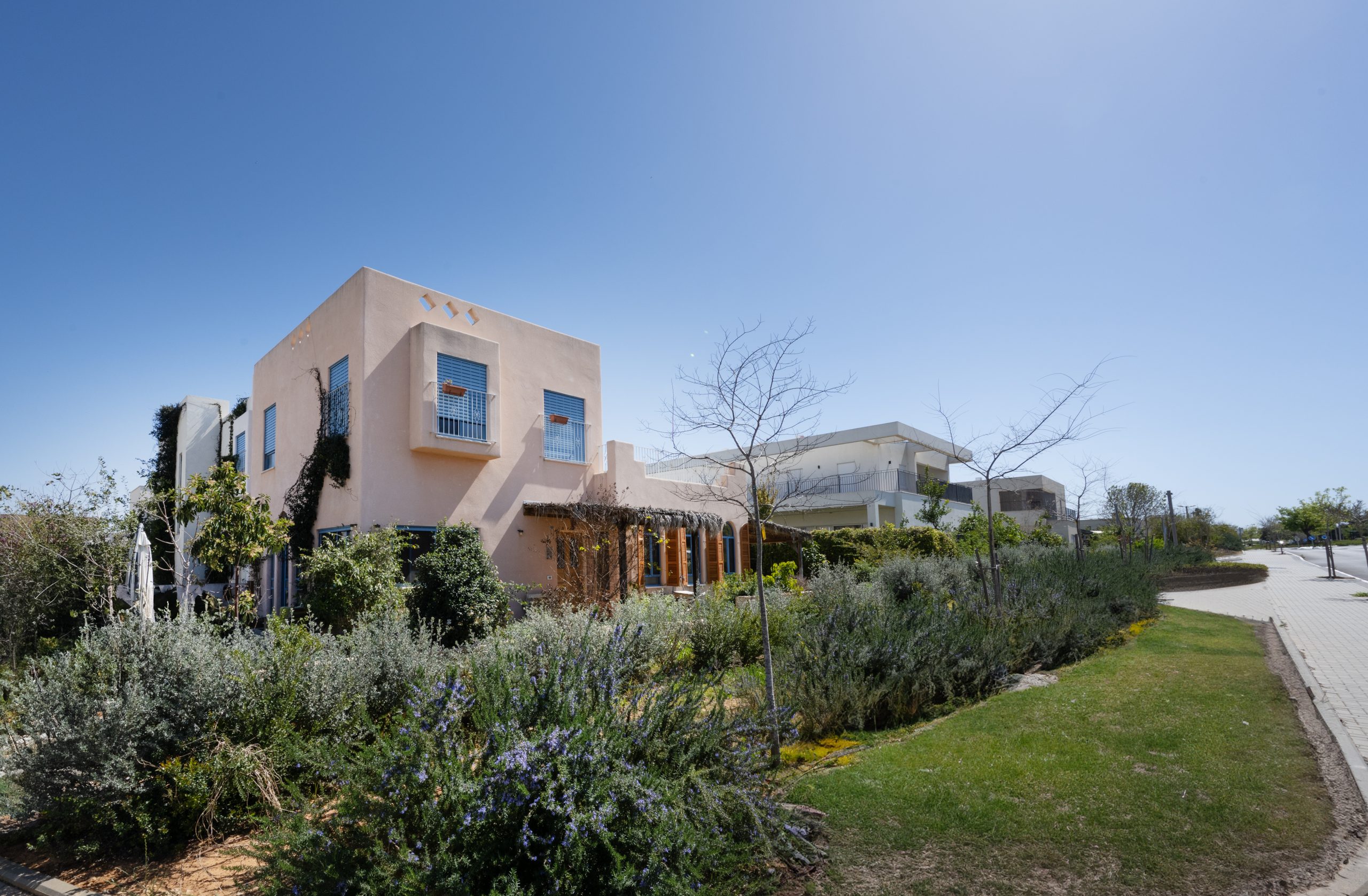 הגינה המערבית בכניסה לבית, זכתה בפינת ורדים , פינת פקעות , מטפסים ריחניים על הפרגולות ועצי פרי. השביל לגינה האחורית, המזרחית, טובל בצמחי תבלין ומאחור- החצר היותר פעילה- בריכת דגים יפיפיה (אבן חירבה), עץ דולב במרכזו של דשא, גינת ירקות וקיר אבן שזוכה למפלים של מטפסים.